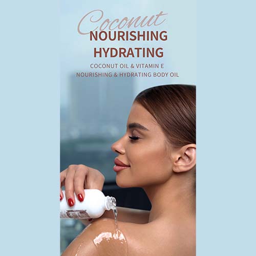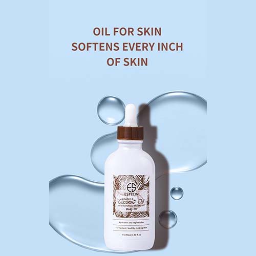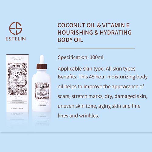 Our coconut oil with vitamin E is a very light-weight and super absorbent multi-purpose oil This 48 hour moisturizing body oil helps to improve the appearance of scars, stretch marks, dry, damaged skin, uneven skin tone, aging skin and fine lines and wrinkles