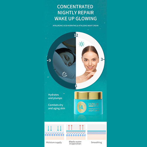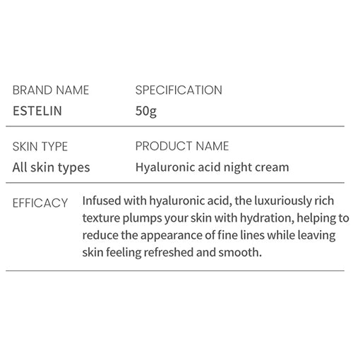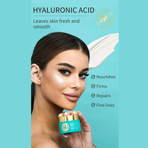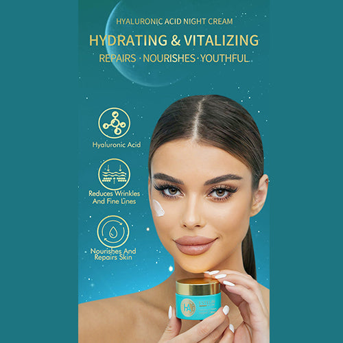 Hyaluronic Acid Night Cream BenefitsInfused with hyaluronic acid, the luxuriously rich texture plumps your skin with hydration, helping to reduce the appearance of fine lines while leaving skin feeling refreshed and smooth. Multi-beneficial hydrating and plumping properties, combats dryness and aging skin, hyaluronic acid night cream firms your skin whilst you sleep, helping you wake up to a radiant glow.